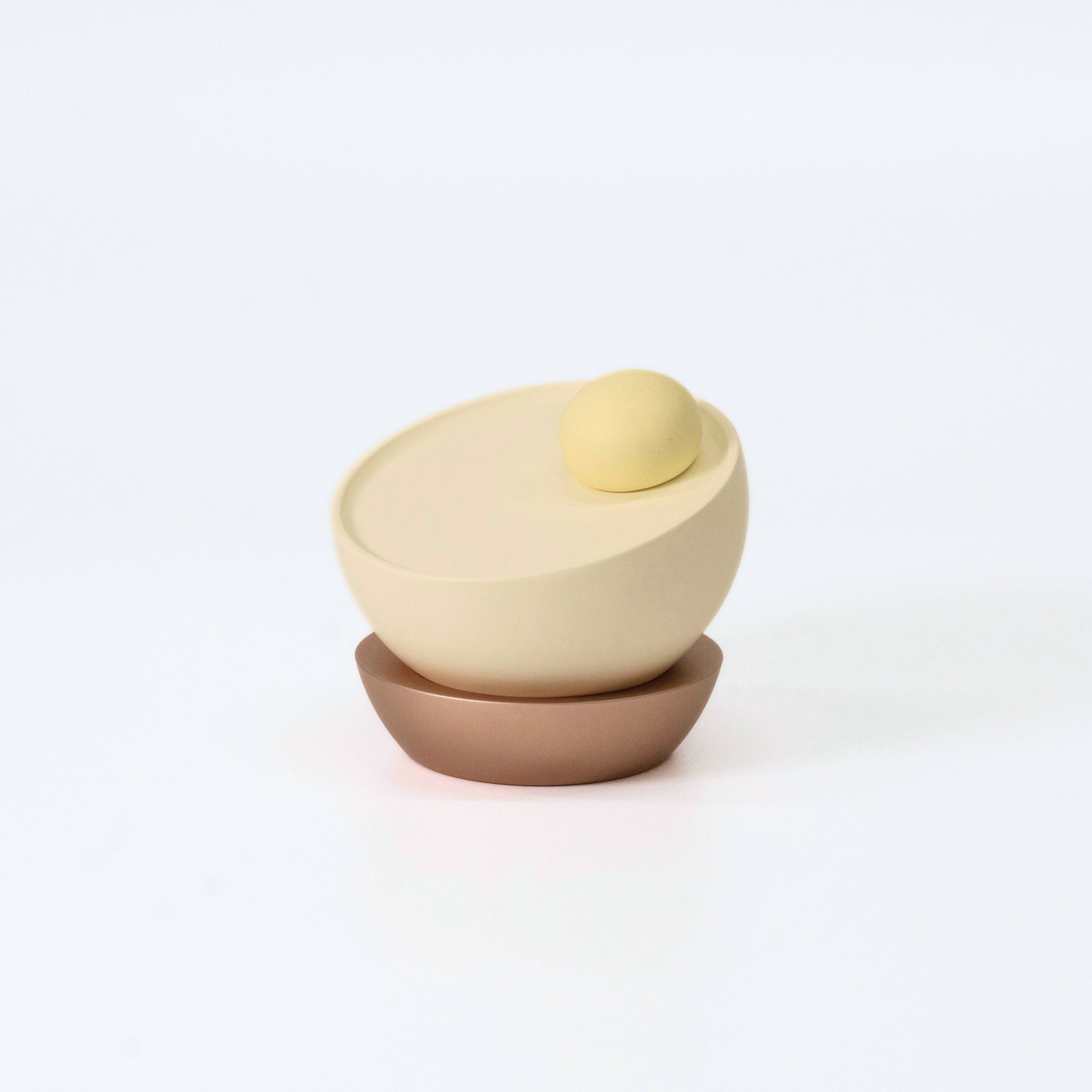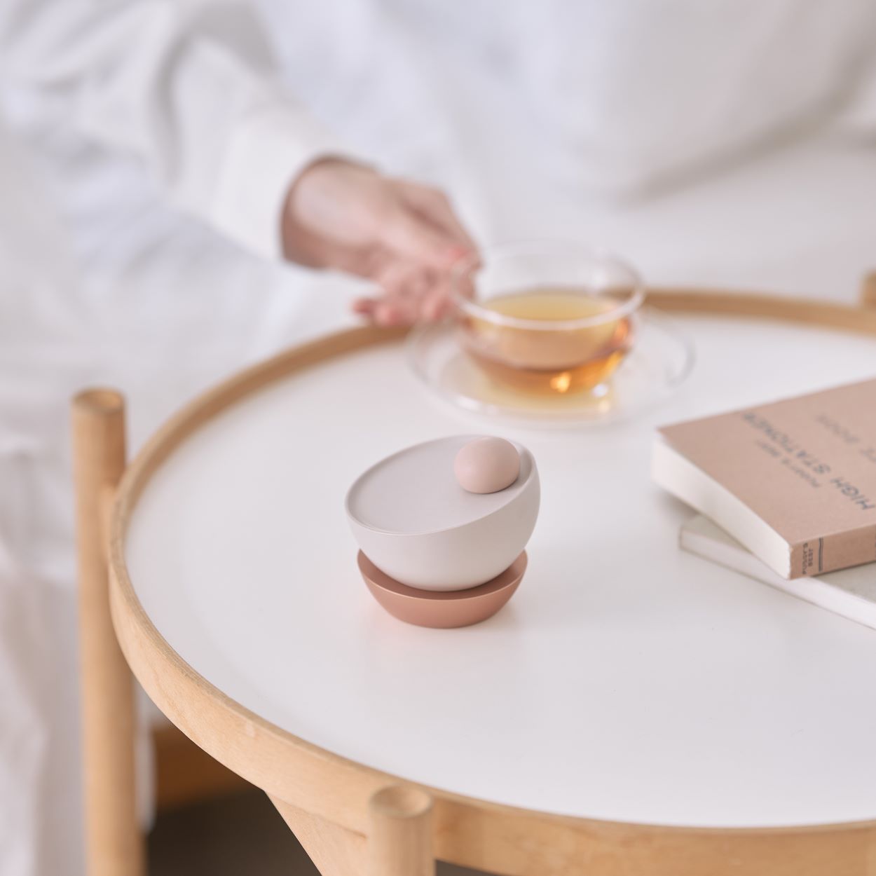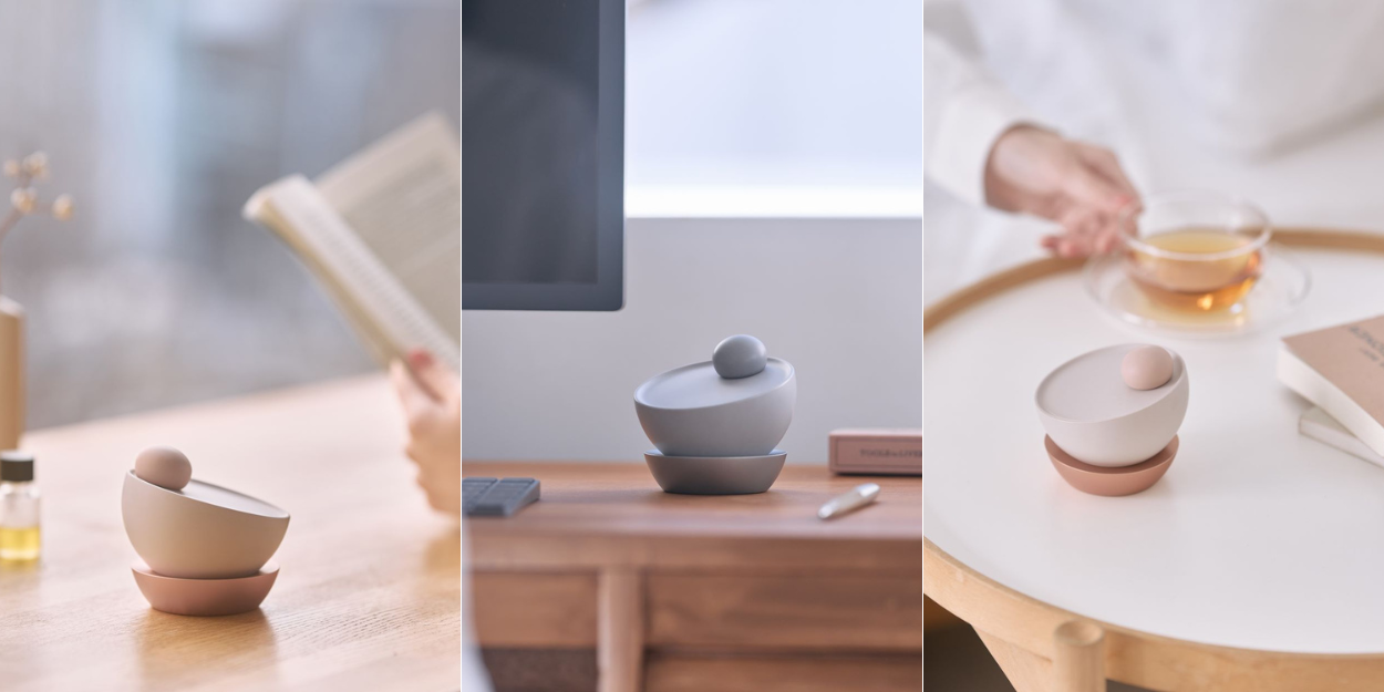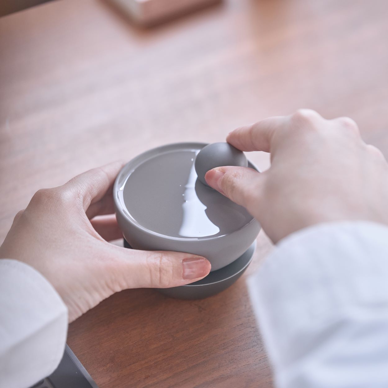 ユニークな形状で、円を描くようにアロマオイルを擦る所作は、円相(えんそう)を連想させ、流れ続ける動きを表現しています。擦る心地よさを感じながら、お好みのアロマの香りをお楽しみいただけます。