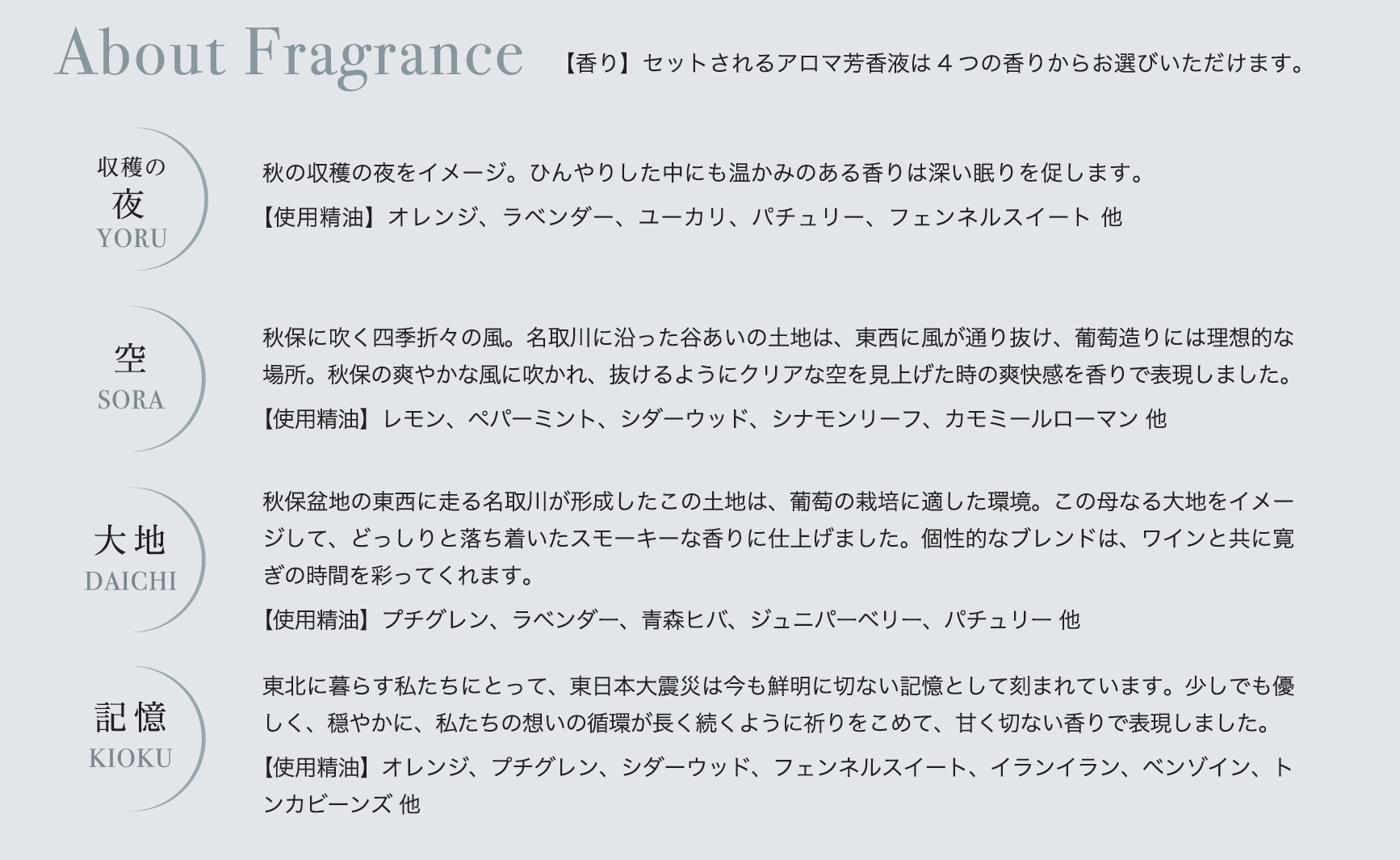 宮城、秋保ワイナリーの自然をイメージしたオリジナルブレンドは色々な香りを楽しみたい方にもおすすめ。